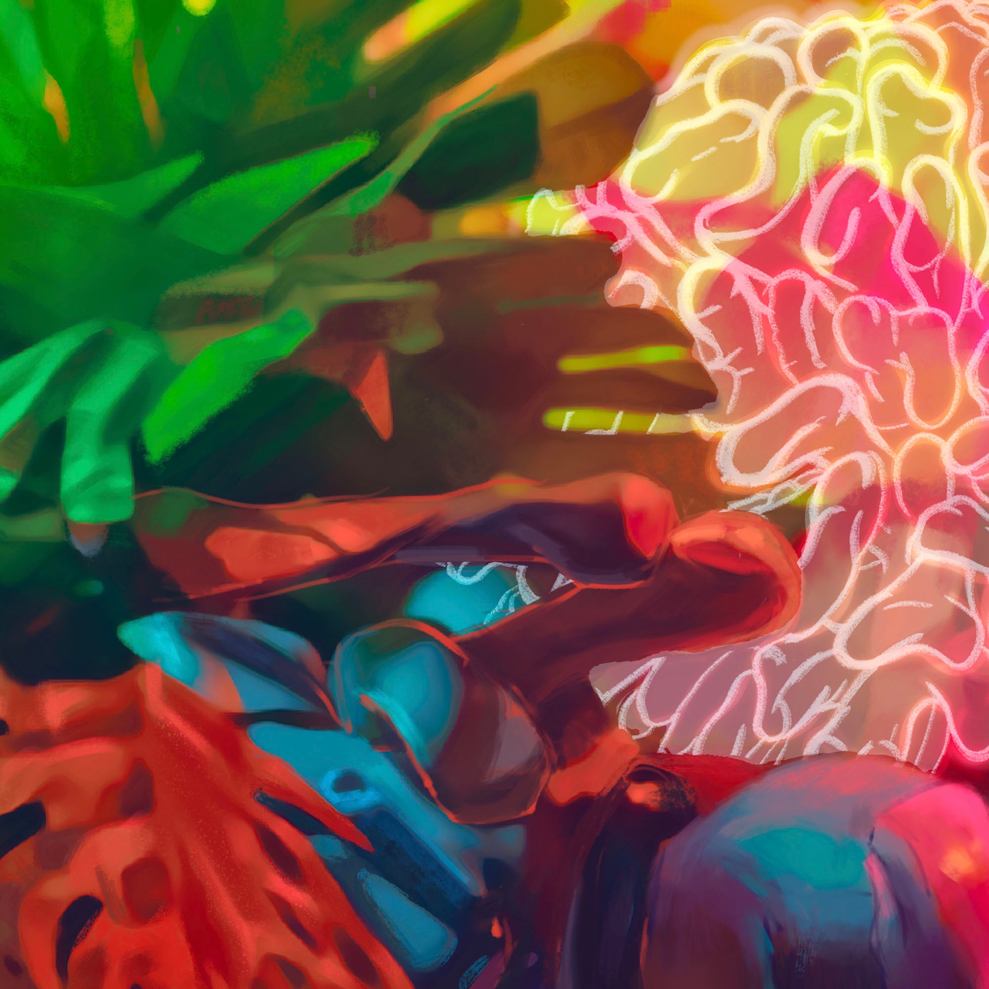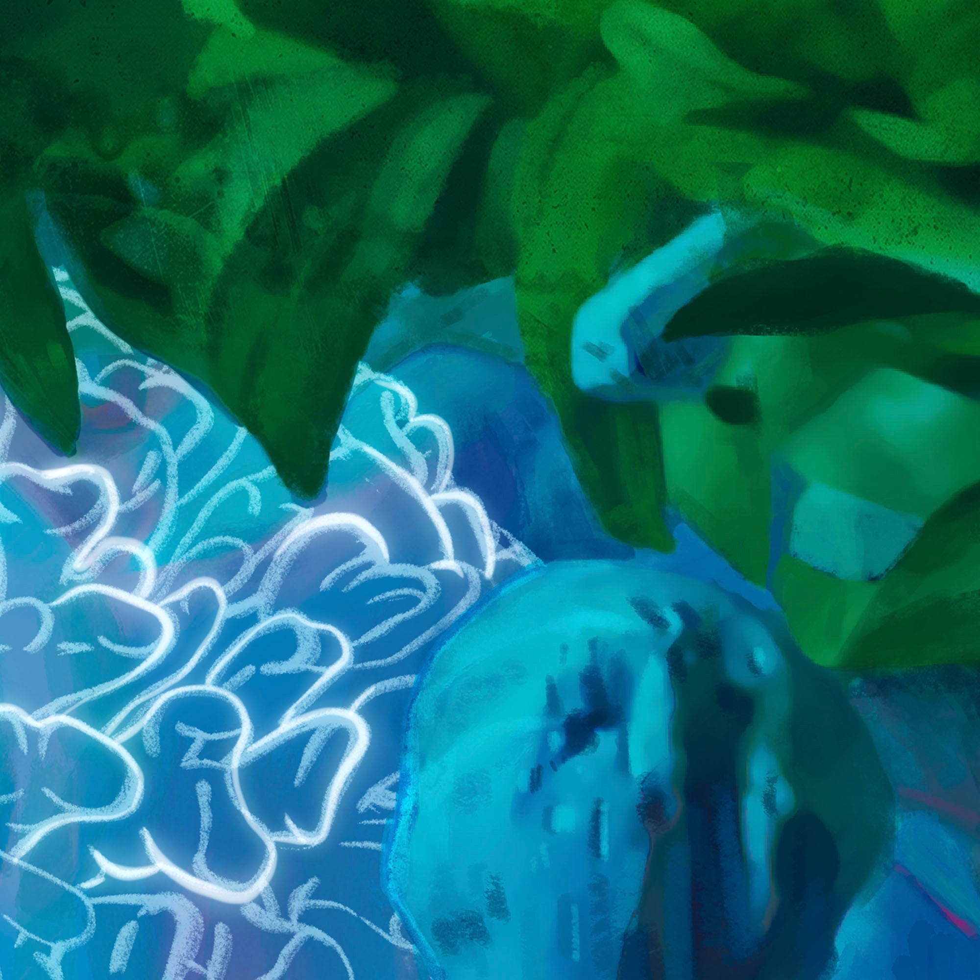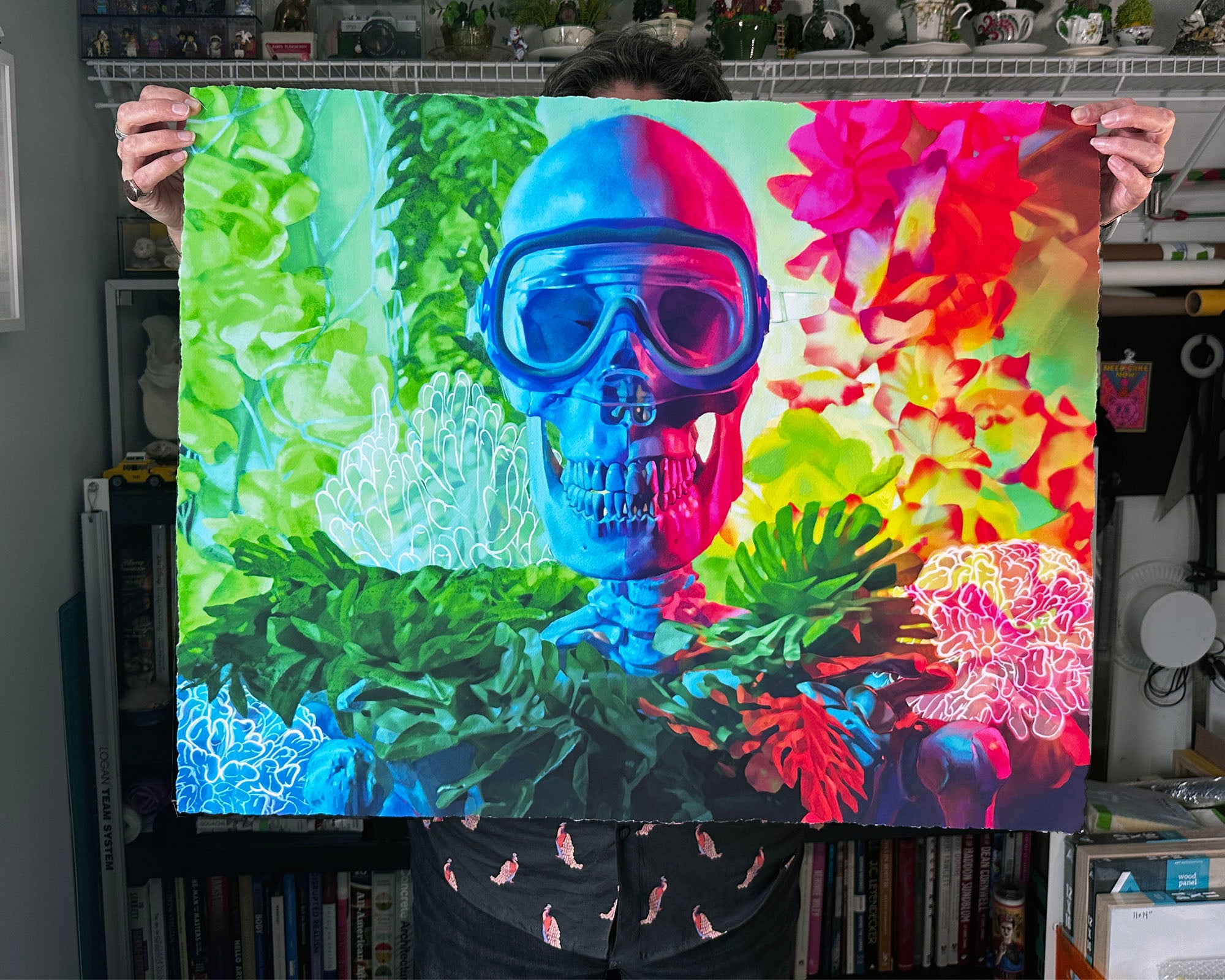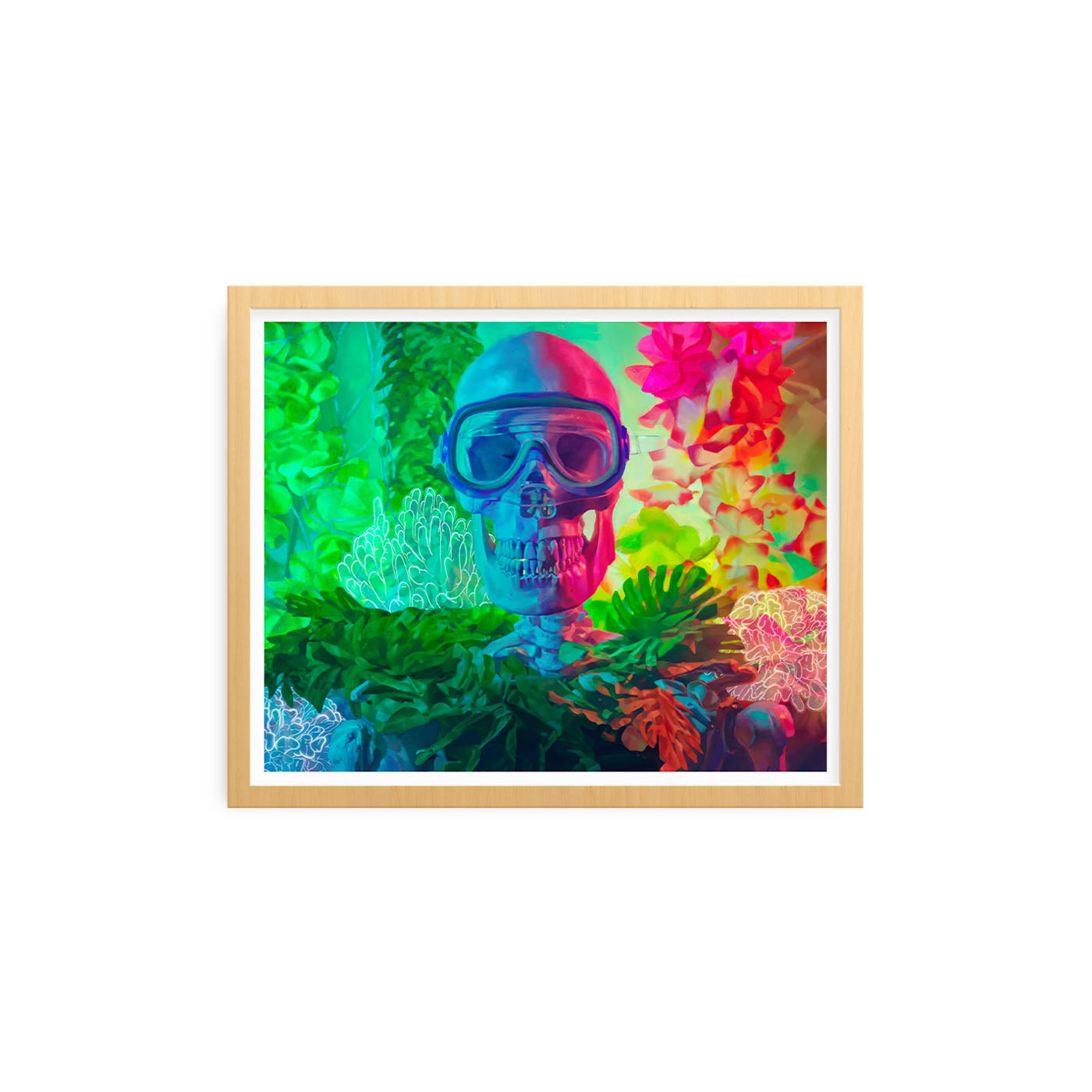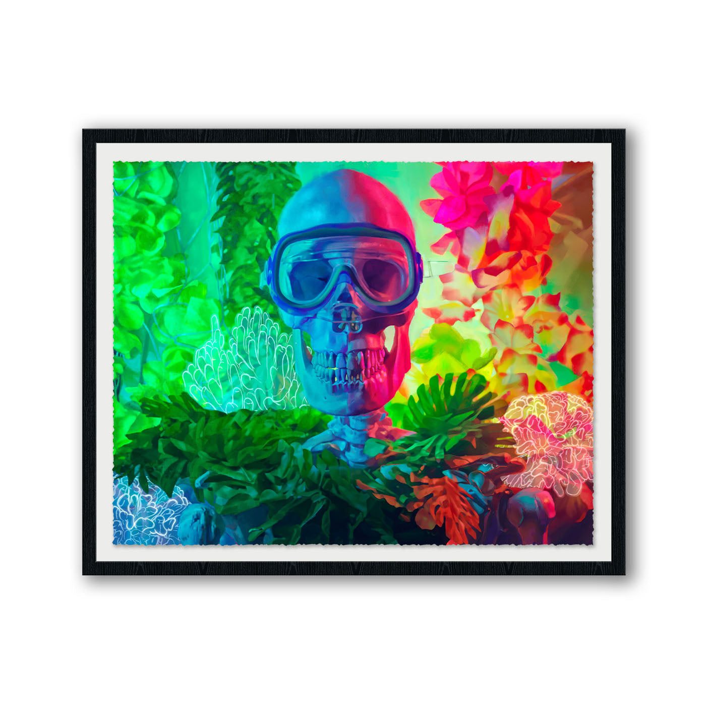 The traditional memento mori is repurposed here as a memento aqua, submerged in an environment that is simultaneously visually stunning and critically imperiled. The reef’s electric, hyper-saturated hues serve as a warning—a vibrant but hollow beauty born of chemical imbalances, algal blooms, and the cumulative stress of coastal development. Integrated into the very structure of the reef are spectral coral forms, symbolic of an ecosystem at a critical juncture where the memory of a healthy, biodiverse ocean is being replaced by the indelible ghost-print of human impact. This piece is a plea to preserve the living reality of our seas before only the image remains.