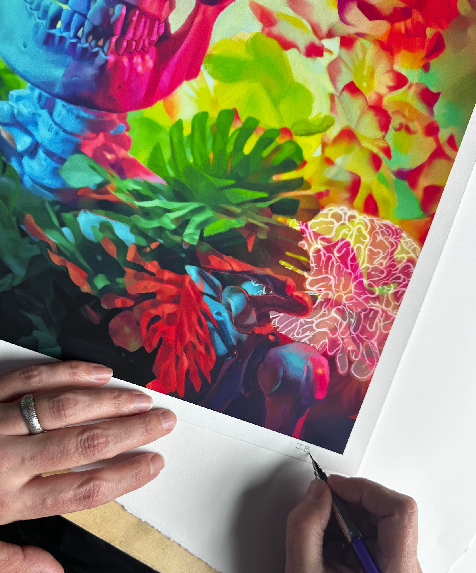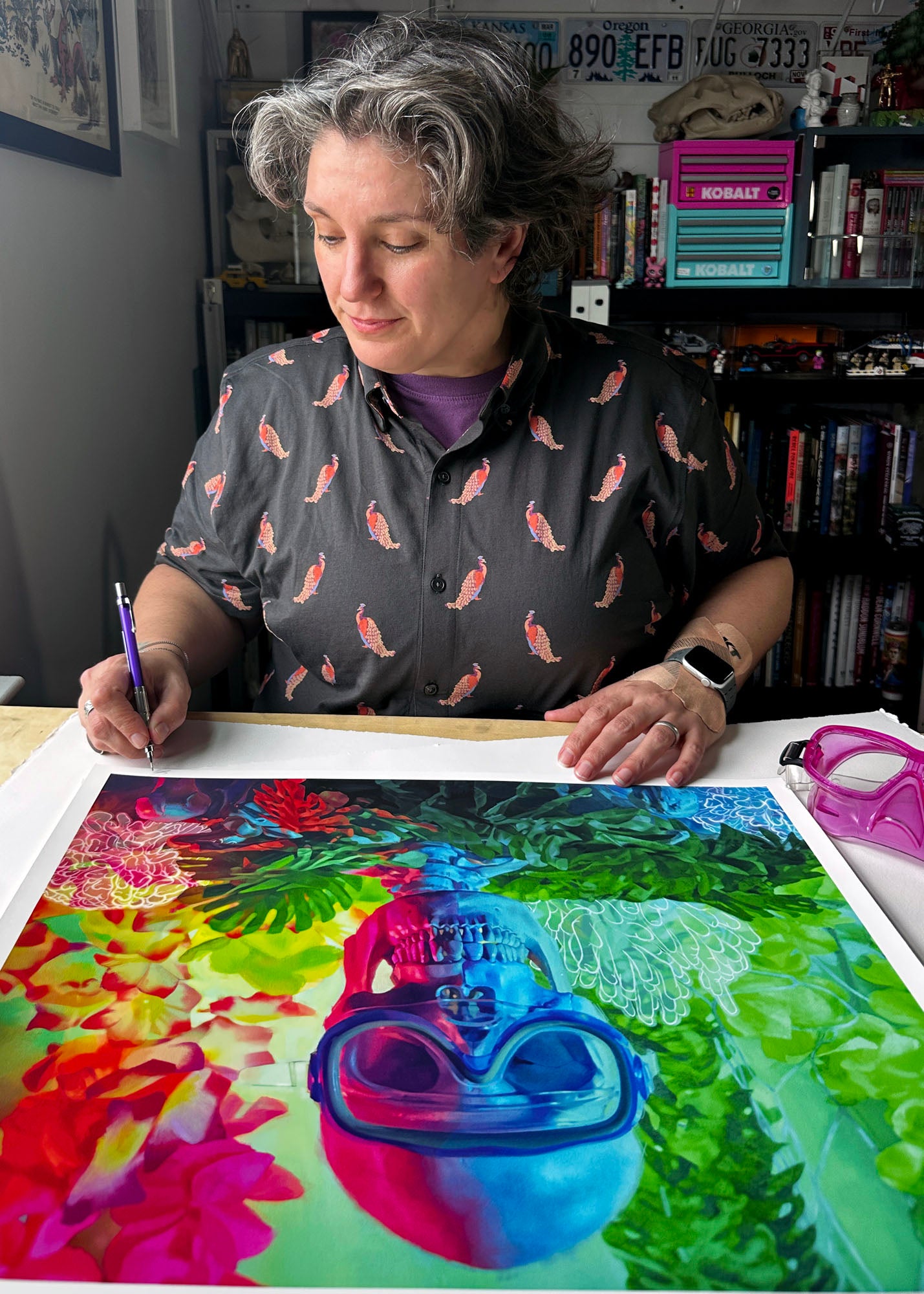 J.B. (Jessica Burke) creates vivid, labor-intensive drawings that dance on the edge of magical realism and memento mori. An Associate Professor of Art at the University of North Carolina, Charlotte, J.B. uses her work to dissect the rituals of folklore and the inevitable decay of both the body and the environment. Whether working in her signature colored pencil or through digital painting, her art serves as a vibrant witness to impermanence. Her work has been curated into solo and group exhibitions at prestigious venues including the Mint Museum, Arch Enemy Arts, Aqua Art Miami, and the LuXun Academy in Liaoning Province, China. A widely published artist, her work can be found in the pages of Creative Quarterly, 3X3 Illustration International, and Hi-Fructose Magazine. Her latest print, explores the "ghost-prints" of human impact, challenging viewers to find beauty and urgency in the ecosystems we are currently rewriting.