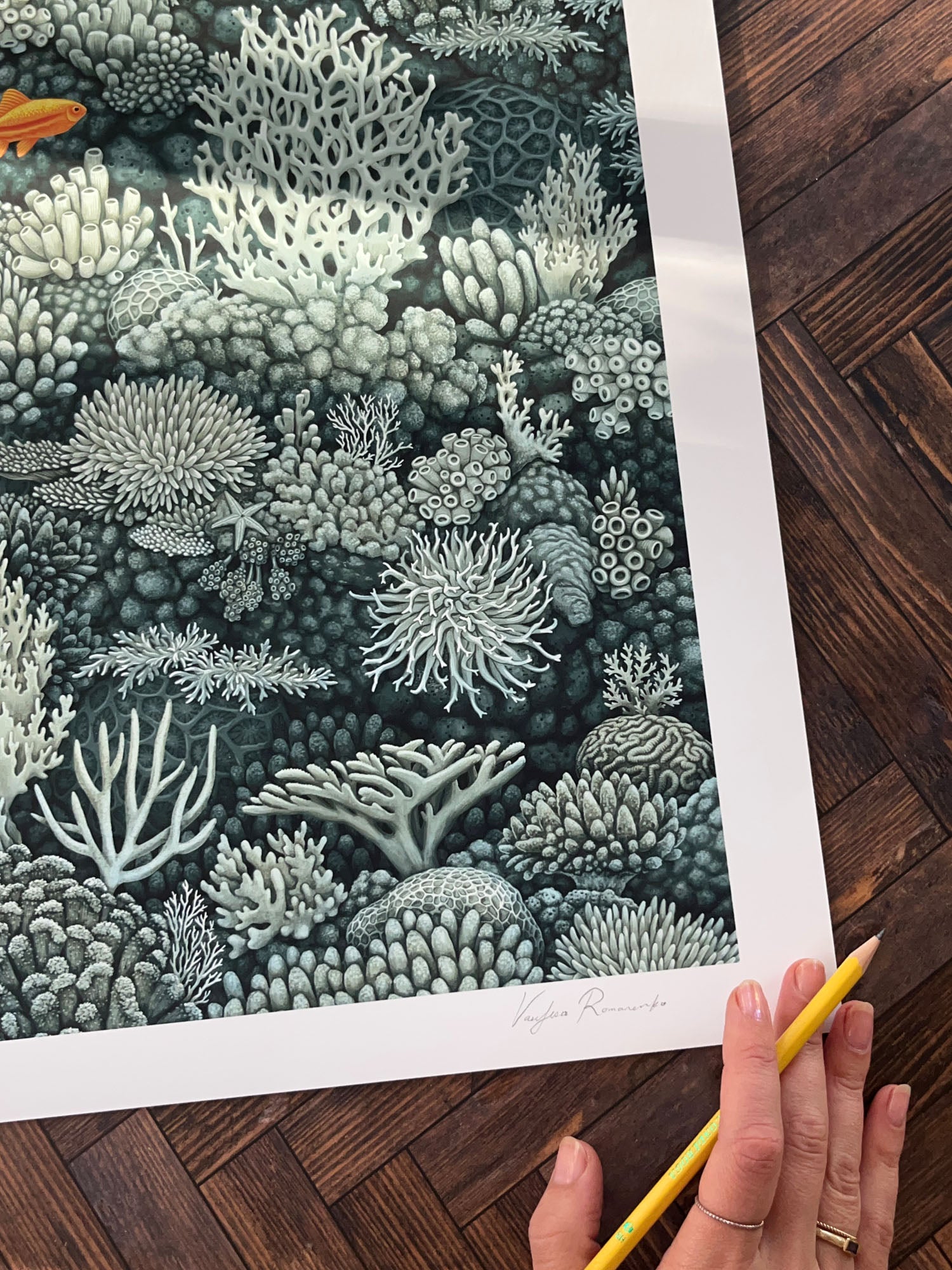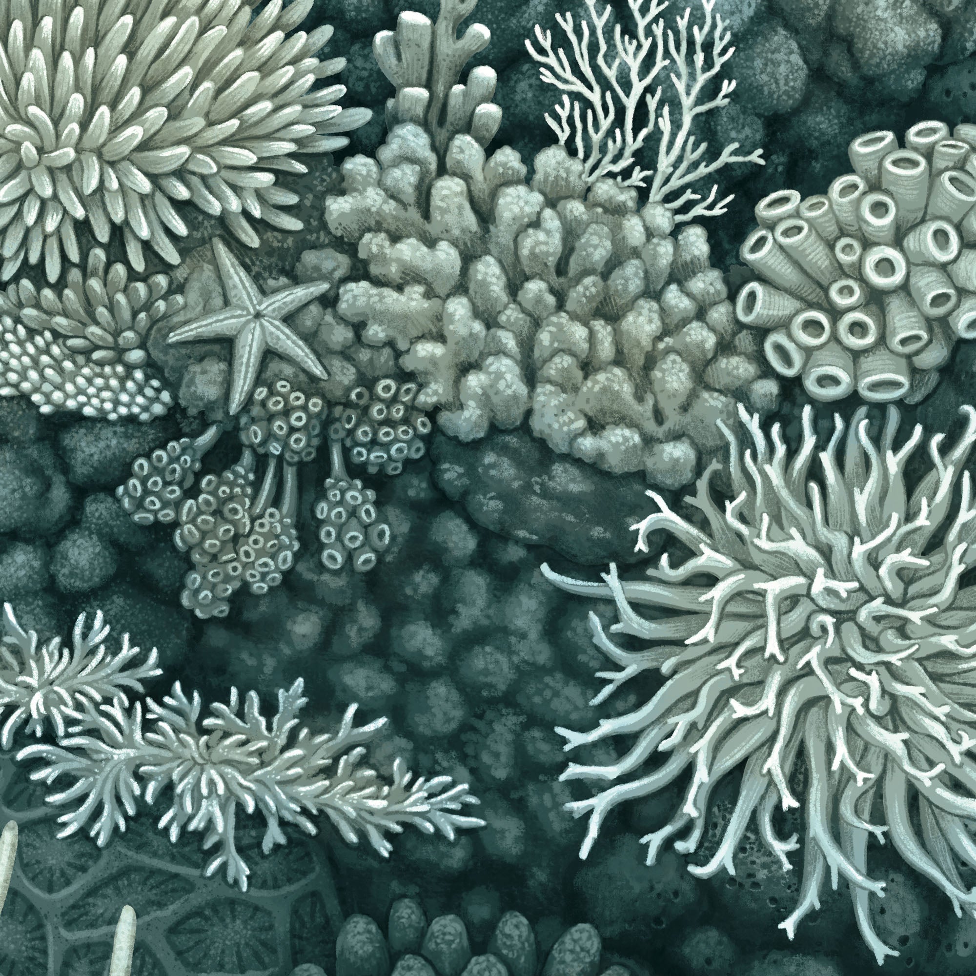 With this piece, I wanted to depict a barren coral reef, which has died due to acidification. What we can presume was once a thriving reef is now devoid of life and color.