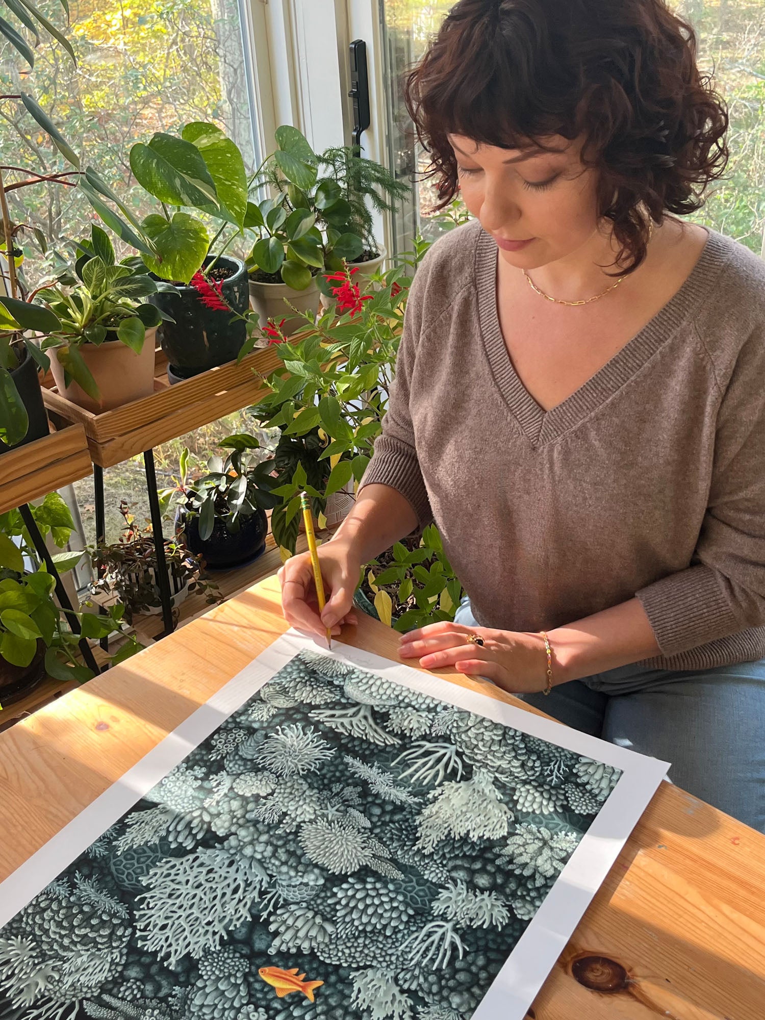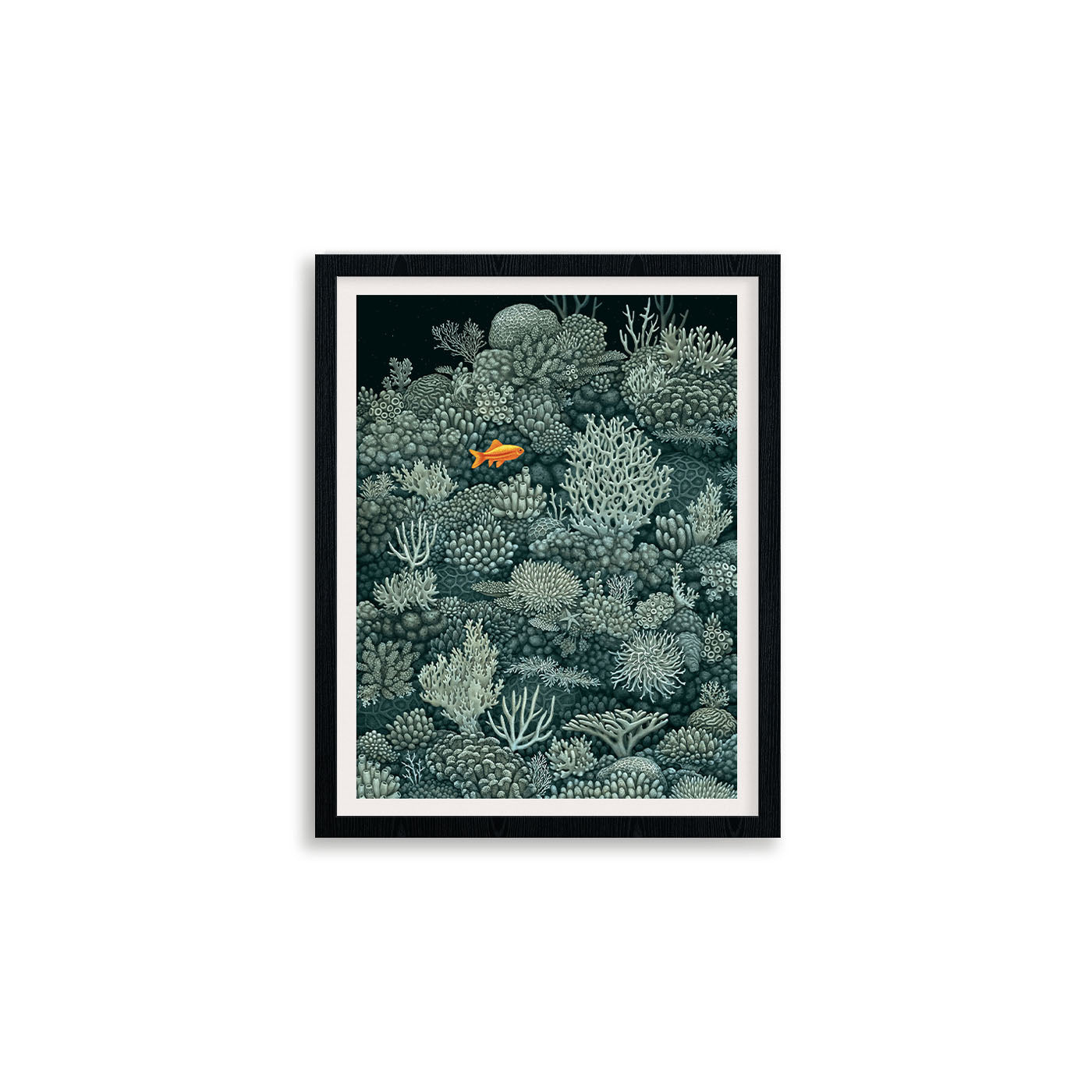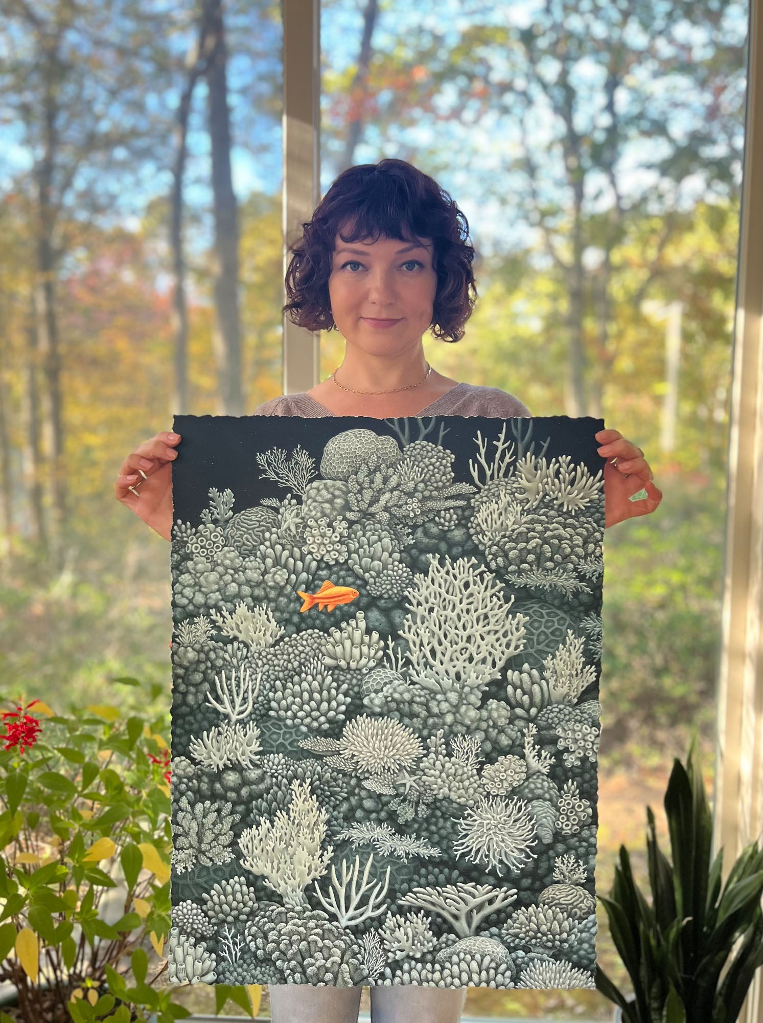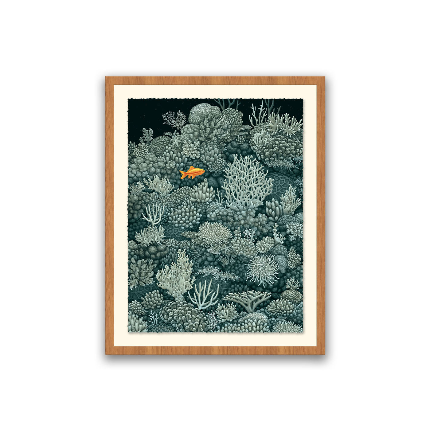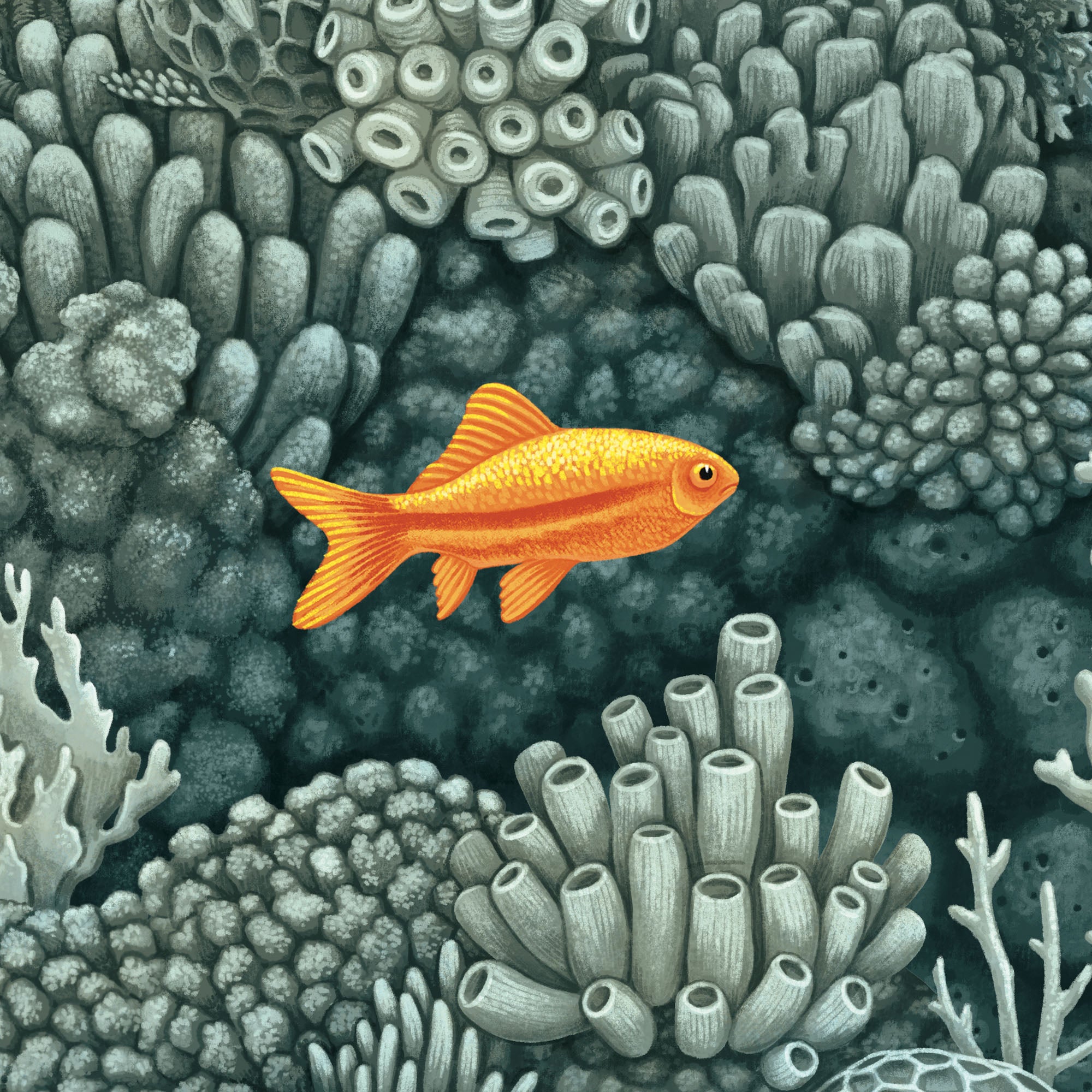 The one orange fish swimming through the dead coral reef in my painting is a reminder of what once was.